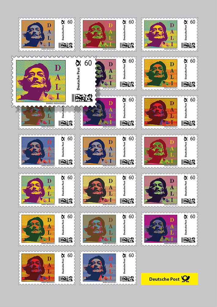 20 selbstklebende Briefmarken im individuellen PopArt-Stil auf einem DIN A4-Bogen.